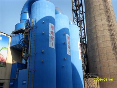 設(shè)計(jì)采用氣動(dòng)旋流技術(shù);脫硫吸收塔為鋼筋混凝土(內(nèi)壁涂敷耐磨、耐腐蝕涂層)與耐酸不銹鋼復(fù)合結(jié)構(gòu),內(nèi)置3級旋流板與4級布液管組。從燃燒設(shè)備中排出的含塵與二氧化硫煙氣由進(jìn)風(fēng)口切向進(jìn)入復(fù)合式脫硫塔,首先與第一級霧化噴嘴噴射的吸收液混合;煙氣向上通過氣動(dòng)旋流板,與旋流板之上布液形成的強(qiáng)力水膜混合、傳質(zhì),脫硫生成物與被捕集煙塵由氣、液挾裹、離心趨壁,匯聚成為水膜在設(shè)定的環(huán)形通道下泄;其上部設(shè)置2級除霧脫水旋流板與布液、沖洗結(jié)構(gòu),煙氣與吸收液在獨(dú)特的旋流板結(jié)構(gòu)實(shí)現(xiàn)撞擊、凝聚、分離、分流,高效捕集煙氣中的二氧化硫與微細(xì)粉塵。煙氣在吸收塔頂部排出,經(jīng)由連接管進(jìn)入外置脫水器,在脫水器內(nèi)再次完成高效氣、水分離。凈化煙氣引入煙囪排放。